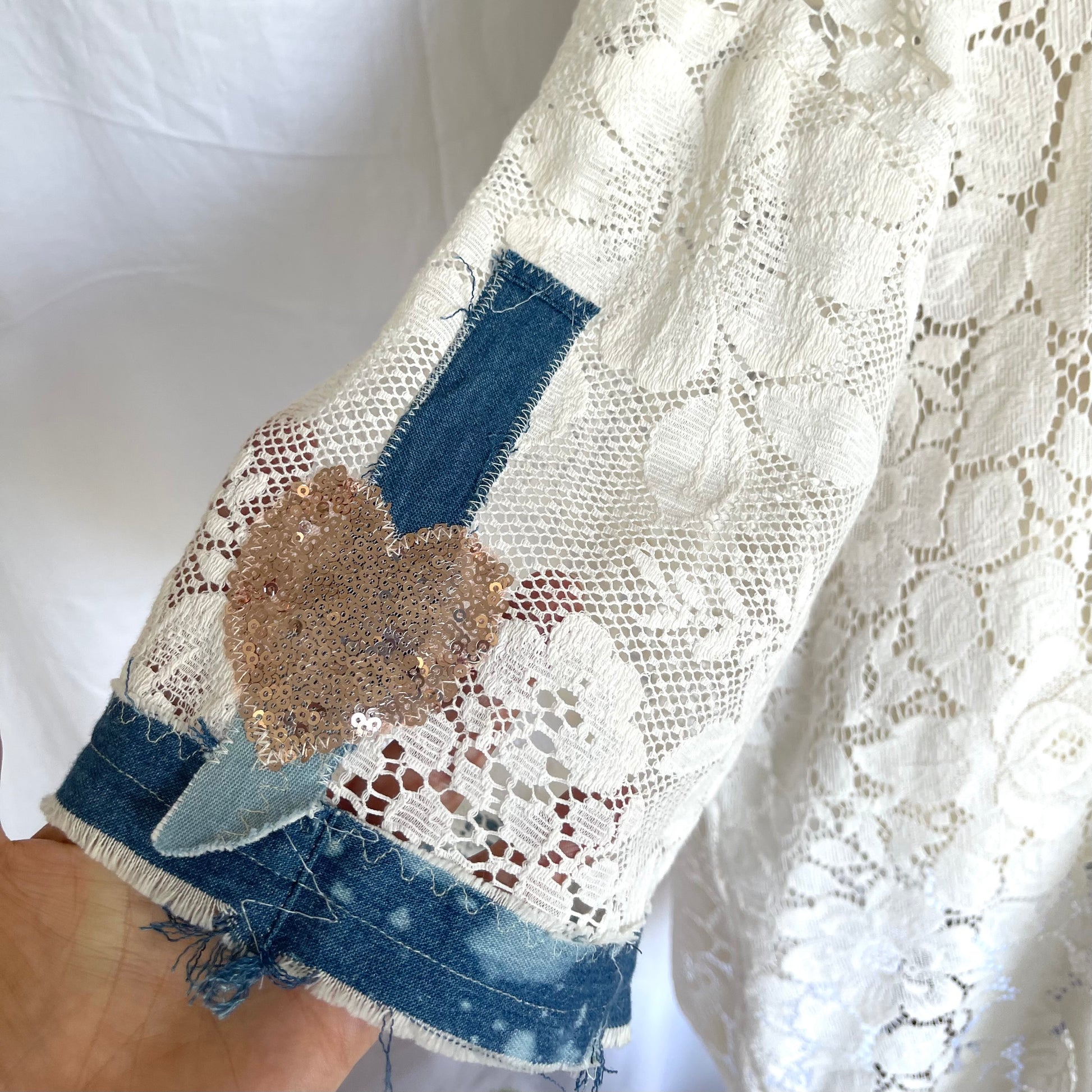 This Top has a mixture of cool and pretty with patches of distressed denim and the gold sequin details.