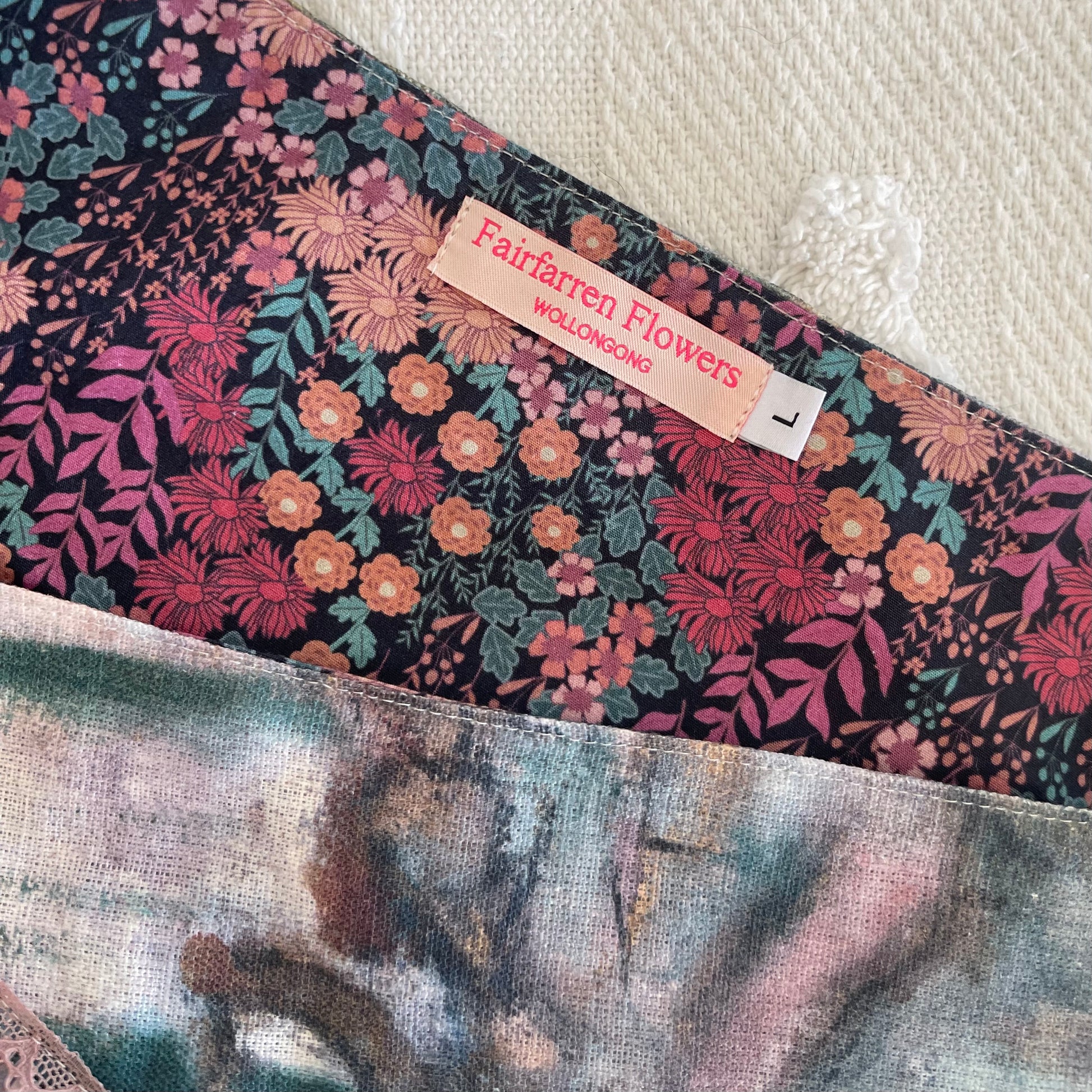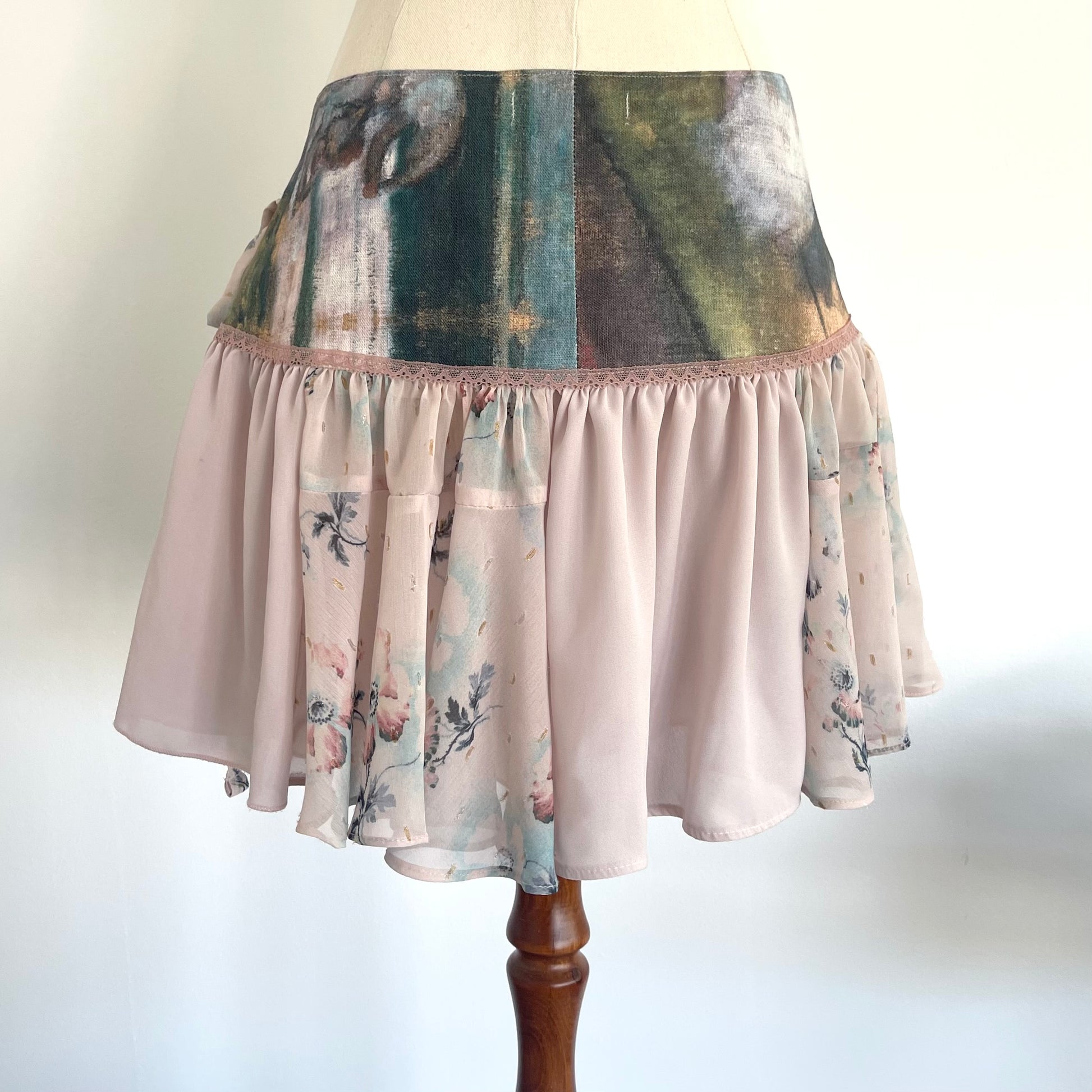 Fabrics are a mix of upcycled fashion, dead stock remnants Oil Painting skirt has a mix of synthetic and linen